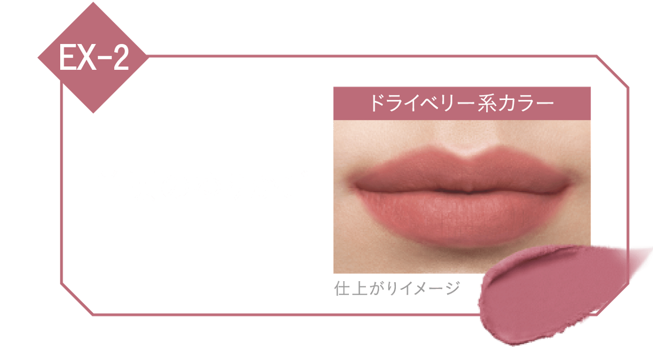 | EX-2 鉄色モンスター | ダークなスモーキーカラーに化ける、ライトグレーの鉄色リップ。 ブルべ向けカラーに変化する。 |