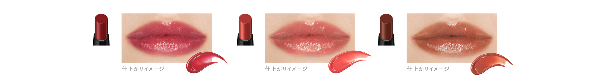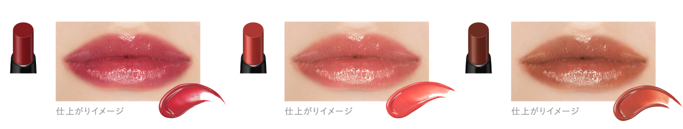 唇に塗布した瞬間、とろけて肉厚なツヤ膜が広がり、“ちゅるんとした”ツヤ仕上がりを叶え、またクリアかつ濃厚な発色のため、ひと塗りでつけたての美発色をキープ。